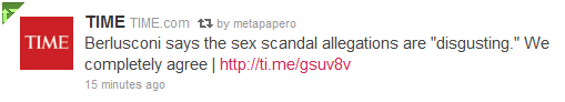Pubblicato il 9 febbraio 2011, in Politica, società con tag Berlusconi, Time. Aggiungi il permalink ai segnalibri. Lascia un commento.