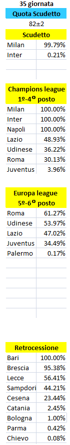 Alla 35sima giornata ormai statistica e matematica vanno a braccetto.Mentre al Milan manca lo zerovirgola per cucirsi il 18simo scudetto, in Champions noi ci siamo al 100%, con solo lo 0,2% di possibilità di arrivare quarti.