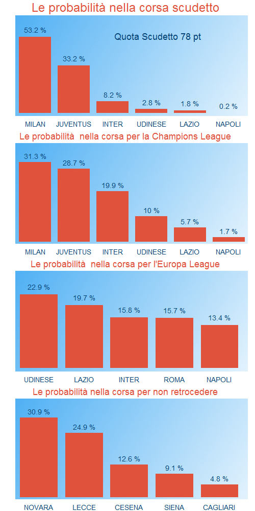 considero le medie goal (fatti e subiti in casa e trasferta) delle ultime 10 partite disputate e simulo i risultati delle partite con una distribuzione poissionana che ha come media appunto quelle che ho calcolato. Quindi simulo l’andamento del campionato per 1000 volte e conto quante volte le squadre arrivano prima seconda e terza e cosi’ via e cosi’ calcolo le probabilità che vedi rappresentate nelle infografiche