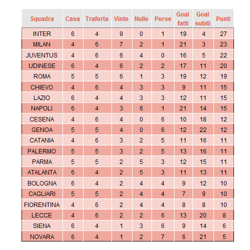 Pochi cambiamenti nell’ultima giornata. In grande spolvero l’Inter con 27 punti sulle ultime 10 partite, sempre in difficoltà il Napoli