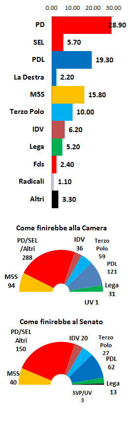 Ho fatto alcune assumption: i piccoli del centro destra e del centrosinistra sono stati sommati al PDL e al PD, che ho considerato correre in coalizione assieme a La Destra e a SEL. Corsa solitaria invece per tutte le altre forze politiche in campo, fatta eccezione per il Terzo Polo che ho considerato si presentasse con una lista unica.