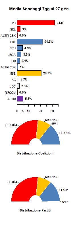 Pubblicato il 27 gennaio 2014, in Politica con tag Berlusconi, camera, coalizioni, deputati, flessione, formazioni politiche, Grillo, intenzioni di voto, M5S, maggioranza, mario monti, media sondaggi, Movimento 5 Stelle, Partito Democratico, PD, PDL, Popolo della Libertà, porcellinum, recupero, Renzi, risalita, Scelta Civica, Senato, sondaggi politici, trend. Aggiungi il permalink ai segnalibri. Lascia un commento.