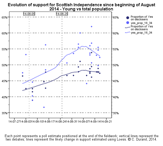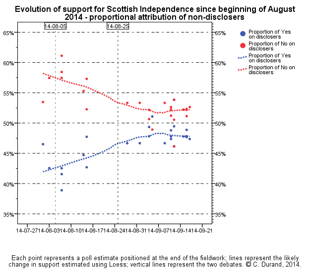 Oggi si vota in Scozia per l’indipendenza e qui ho trovato una interessante analisi fatta da Claire Durand, professoressa di Sociologia all’Universita’ di Montreal e membro della WAPOR (Associazione mondiale dei ricercatori sulla Pubblica Opinione) e della associazione internazione delle metodologie sogiologiche.
