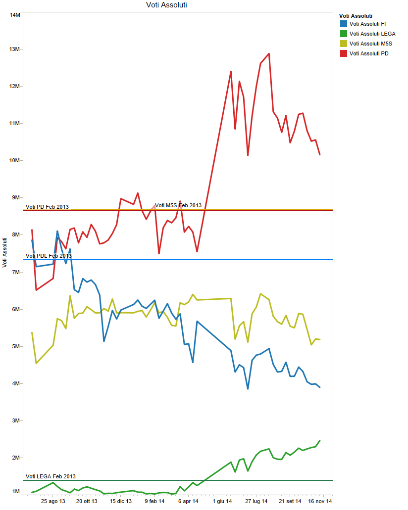 La Lega al 9.5%: questa e’ forse la notizia più interessante delle medie sondaggi di questa settimana. Con un PD che traballa attorno a quota 40% – questa settimana nuovamente sotto, al 39%- e con Forza Italia e Movimento 5 Stelle che proseguono il trend negativo – uno al 15%, l’altro ancora sotto il 20% – il partito di Salvini punta nettamente alla doppia cifra. Certo occorre avere ben presente che la partecipazione al voto -se si andasse alle elezioni- sarebbe ai minimi da agosto, solo il 55% degli elettori andrebbe a votare questa settimana, e in questo contesto le formazioni minori con un elettorato ben convinto tendono a spuntare migliori risultati alla lotteria dei sondaggi rispetto ai grandi partiti di massa che scontano un consenso maggiormente liquido che facilmente si nasconde nell’astensione; tuttavia il trend della Lega e’ solidamente crescente dallo scorso aprile, come ben mostra il grafico dei voti assoluti, ottenuto moltiplicando la percentuale dei sondaggi con la partecipazione al voto moltiplicando il tutto per la cifra del corpo elettorale. In questo grafico infatti la Lega, all’apice di una retta chiaramente ascendente, raggiunge i 2.4 milioni di voti assoluti, 1 milione in piu’ del risultato di Febbraio 2013. Opposti appaiono invece i trend di Movimento 5 Stelle e Forza Italia che evidenziano come il primo abbia perso 3.5 milioni di voti e il secondo ben 4 milioni dalle passate elezioni politiche. Preoccupante per Renzi anche il grafico del PD: in continua ascesa fino ad agosto 2014 con un massimo teorico di quasi 13 milioni di elettori, in 3 mesi ha perso oltre 2.5 milioni di potenziali elettori che ad occhio si sono rifugiati nell’astensione.