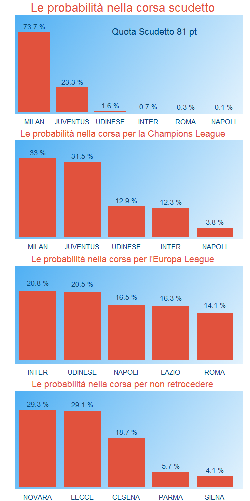L’ultimo turno si conferma importante anche alla luce delle nostre statistiche. Il vistoso rallentamento della Juve si riverbera sulle sue probabilità di vittoria finale. Ora e’ infatti il Milan a guidare le danze con quasi il 60% di probabilità di vincere lo scudetto, seguito dalla Juve con il 37%, ribaltando in pratica i risultati della settimana scorsa. Ancora bassa la quota scudetto a 77 punti. L’altra nota della giornata e’ la scomparsa dell’Inter dai radar, del resto i nerazzurri hanno una media da retrocessione nelle ultime 10 giornate. Pimpanti Napoli e Lazio che hanno numeri non disprezzabili nella corsa all’Europa. In affanno invece l’Udinese. Nelle retrovie la situazione e’ caldissima, la quota salvezza e’ arrivata a 42 punti e mentre Novara e Cesena sprofondano sempre di più l’ultimo posto per la B se lo giocano un Lecce in grande spolvero e il Siena, con un Parma che non e’ propriamente tranquillo