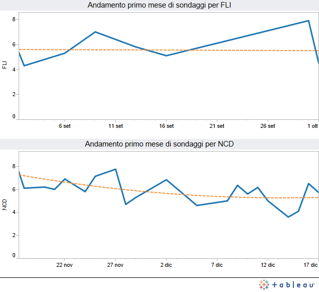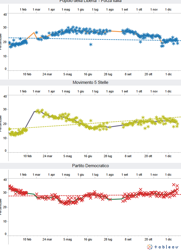 Anche qui sembra di trovarsi davanti a un partito dell’eterno ritorno. A inizio gennaio 2012 ha un consenso medio del 18.5% la settimana dopo tocca il minimo annuale al 16.5% alle elezioni di febbraio tocca il 21,5%, schizza al 30% a maggio dopo le elezione di Napolitano alla Presidenza della Repubblica, poi cala costantemente fino a scindersi in Forza Italia e Nuovo Centro Destra e poi risale al 21% con cui chiude l’ultima settimana del 2012. Una breve nota su NCD: dopo un mese di rilevazioni ha le stesse percentuali di Futuro e Libertà di Fini un mese dopo la scissione.