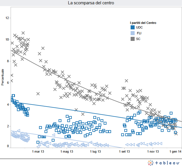 Alla fine l’unica vera novità del panorama politico italiano pare essere la scomparsa del centro. Scelta Civica per l’Italia , il rassemblement politico tra Mario Monti, Pierferdinando Casini e Gianfranco Fini inizia il 2013 con uno scoppiettante 14% in media, e lo chiude con un misero 4%. Nel mezzo un deludente risultato alle elezioni che spinge fuori dal parlamento il precedente Presidente della Camera, quindi, e’ cronaca di questi giorni, la scissione in due gruppi parlamentari senza aver mai realmente inciso nel dibattito politico ed elettorale di questi mesi, risultando sostanzialmente ininfluente se non probabilmente nell’aver negato una vittoria più ampia al centrosinistra alle elezioni nazionali, con tutto quello che ne e’ seguito.