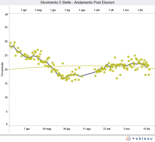 Un andamento probabilmente dovuto anche qui dell’incapacità di far fruttare il risultato nazionale e ben sottolineato nell’andamento dei risultati nelle elezioni locali. Ad Aprile alle regionali in Friuli conferma solo il 52% dei voti ottenuti alle elezioni nazionali, a maggio nelle elezioni comunali di Roma il 34%, in Trentino, in occasione delle elezioni provinciali in ottobre, conferma solo il 24% dei voti ottenuti pochi mesi prima. E se in Basilicata ne recupera in novembre un buon numero, il 43%, le difficoltà a livello locale continuano a essere notevoli se al primo appuntamento elettorale del 2014, le regionali in Sardegna dove a febbraio il M5S era primo partito, decide di non presentarsi per beghe locali. Insomma anche in questo caso prevale una stasi schizofrenica tra i buoni sondaggi nazionali e i mediocri risultati locali.