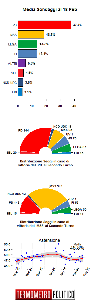 Sempre secondo queste regole il PD sarebbe costretto al secondo turno contro il Movimento 5 Stelle non raggiungendo il 40% dei voti e nell’infografica sono riportate le distribuzioni dei seggi parlamentari alla Camera sia nel caso che il PD vinca il secondo turno, sia nel caso che lo perda.