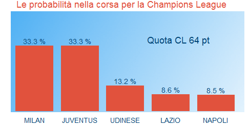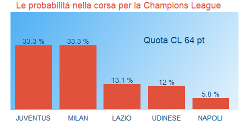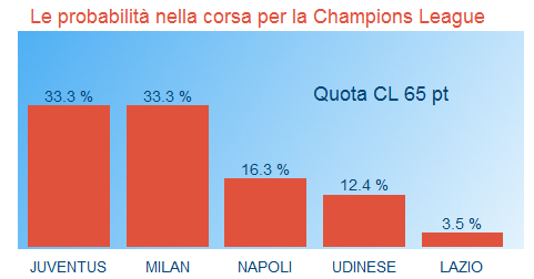 Con la Juve ormai avviata alla vittoria dello scudetto e con una corsa per la salvezza che ormai si riduce a sole due squadre, Lecce e Genoa, con una quota salvezza crollata nel giro di una settimana da 42 a 40 punti rimane apertissima la corsa per l terzo posto valido per la Champions League. La quota per raggiungerlo si e’ ulteriormente abbassata a 61 punti a causa dell’andamento a singhiozzo delle 5 contendenti: Napoli, Inter, Udinese, Lazio e Roma. Le prime 3 sono praticamente appaiate come probabilità, mentre la Lazio, per lungo tempo la favorita sembra cedere di schianto, cosi’ come la Roma.