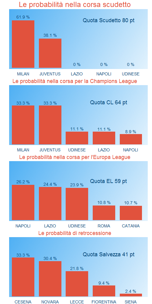 La contemporanea frenata di Lazio, Udinese e Napoli abbassa sensibilmente al quota Champion, ora a soli 66 punti. La juve che vince sul Napoli e riduce a soli 2 punti lo svantaggio sul Milan modifica le sue percentuali di successo, ma lascia il Milan ancora decisamente favorito. Nelle retrovie la frenata del Lecce fa tirare un momentaneo sospiro di sollievo alla Fiorentina