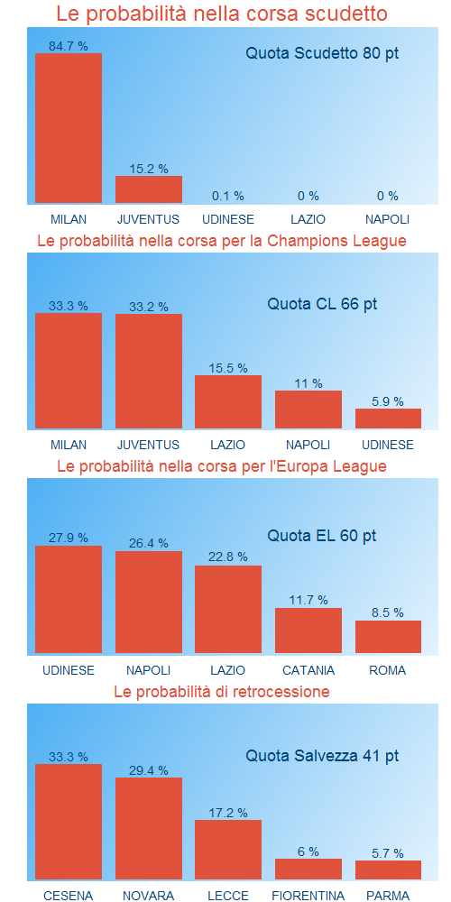 Il mezzo passo falso del Napoli con il Catania, in concomitanza con la vittoria della Lazio sul Cagliari, pone gli aquilotti in pole position per la conquista del terzo posto Champions. Nessun cambiamento in testa e in coda, mentre il Catania pone prepotentemente la sua candidatura per l’ultimo posto disponibile di Europa League forte di una classifica che nelle ultime 10 giornate lo vede secondo dietro solo al Milan, pari merito proprio con gli azzurri.