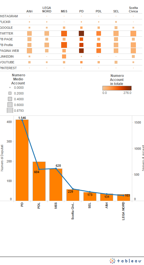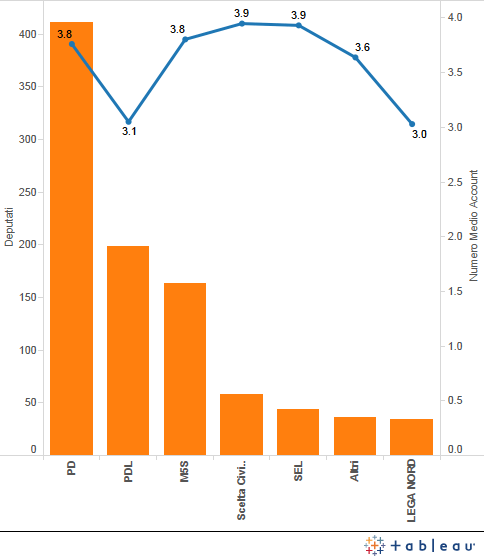 Se consideriamo poi il numero medio di account per deputato per lista vediamo anche che PDL e Lega lo hanno praticamente identico, 3.1 e 3, mentre gli altri partiti oscillano tra 3.8 e 3.9.