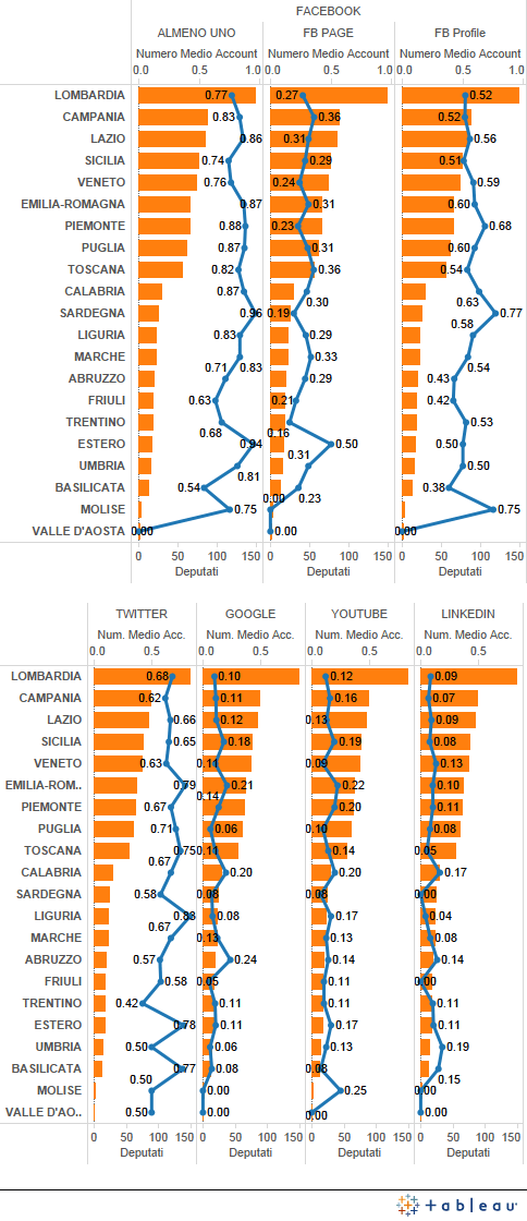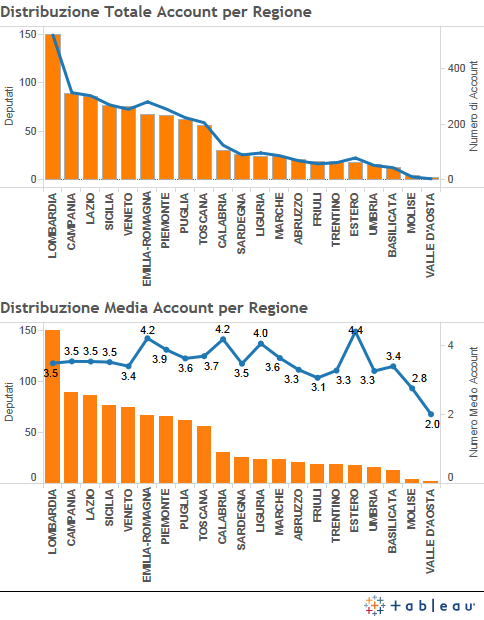Osserviamo infine la distribuzione per regione di elezione. Anche qui notiamo qualcosa di interessante. Ad esempio la Lombardia , pur essendo la prima regione per numero di account assoluto, dovuto al fatto che ha la fetta più consistente di deputati , tuttavia non è la prima per numero medio di account. Tolta infatti la circoscrizione estera, sono Emilia-Romagna e un po’ sorprendentemente la Calabria a primeggiare, con 4.2 account per deputato a fronte appunto dei 3.5 della Lombardia. Questo perché l’Emilia Romagna, sebbene sia sesta come numero di deputati eletti, è quarta come numero assoluto di account sui Social Network.