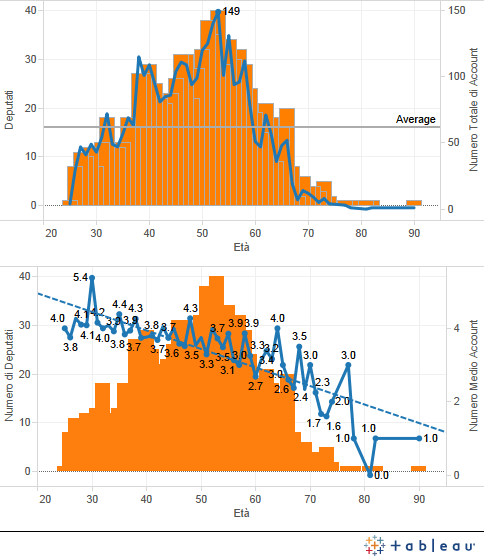 I due grafici sottostanti riportano il numero assoluto di Siti/Account per età e il numero medio di siti e account per età sullo sfondo della distribuzione dei deputati sempre per età.