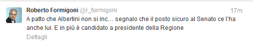 Purtroppo la vis polemica, diciamo cosi’, lo porta a scordarsi che nel 2006 da Presidente di Regione fu eletto pure lui al Senato, facendo proprio quello che contesta ad Albertini. Per cui sostituisce il tweet, già non particolarmente elegante con questo, abbozzando: