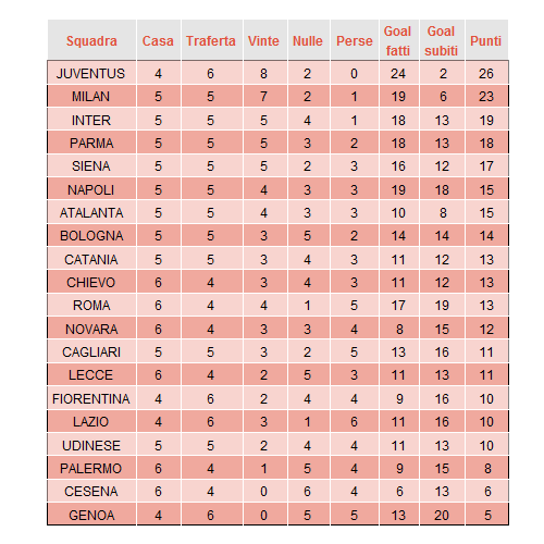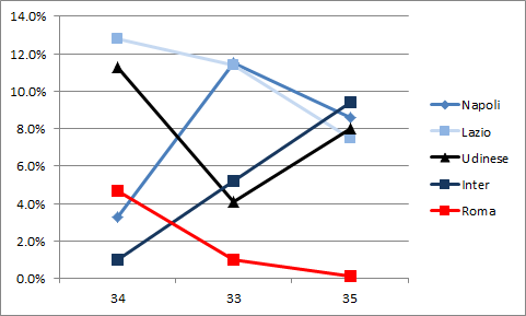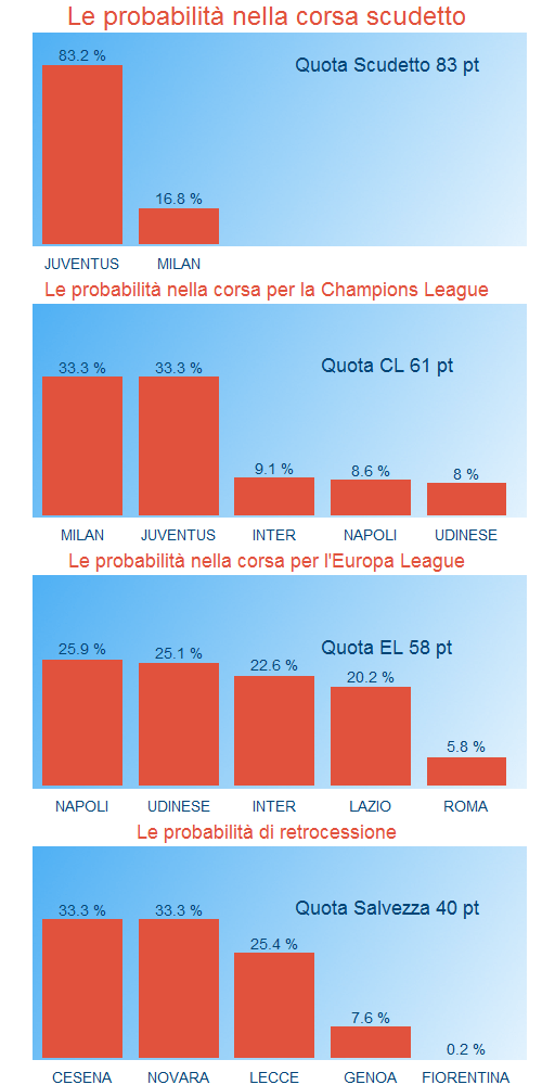 Con la Juve ormai avviata alla vittoria dello scudetto e con una corsa per la salvezza che ormai si riduce a sole due squadre, Lecce e Genoa, con una quota salvezza crollata nel giro di una settimana da 42 a 40 punti rimane apertissima la corsa per l terzo posto valido per la Champions League. La quota per raggiungerlo si e’ ulteriormente abbassata a 61 punti a causa dell’andamento a singhiozzo delle 5 contendenti: Napoli, Inter, Udinese, Lazio e Roma. Le prime 3 sono praticamente appaiate come probabilità, mentre la Lazio, per lungo tempo la favorita sembra cedere di schianto, cosi’ come la Roma.